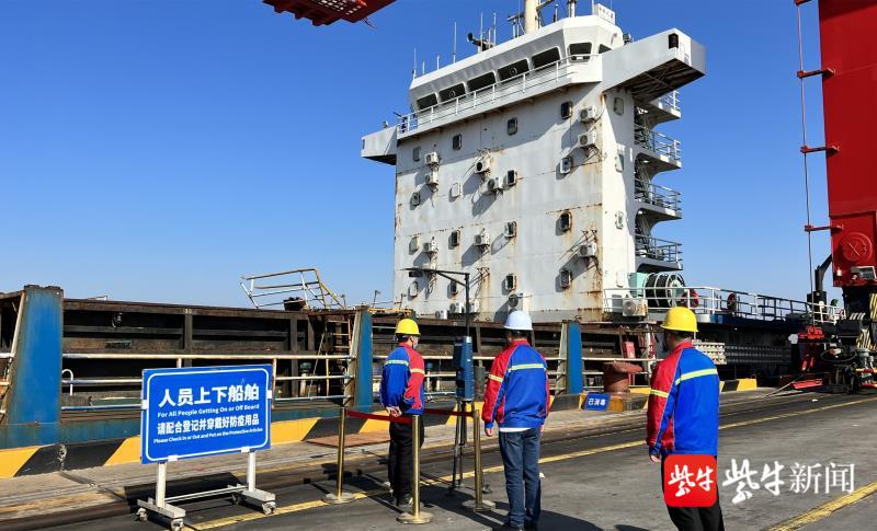 5月5日上午9時,在鹽城港大豐港區通用碼頭2號泊位,一艘裝有5500噸硫磺的伯利茲籍“鴻陽18”輪緩緩進港靠泊,此時在船舶梯口前,大豐海港港口有限責任公司30名碼頭工人,著白色防護服戴安全帽,正在一臺約2.5米高的電子設備前排隊,準備核驗身份后登輪。