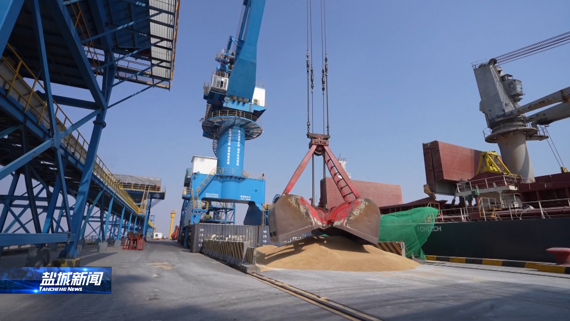 來到鹽城港大豐港區糧食碼頭,一艘裝載著澳大利亞大麥的貨船正在卸貨。接下來,還將有來自巴西裝載著6萬噸大豆的貨船排隊進港。