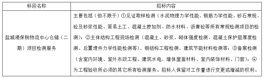 (7)項目標段劃分:鹽城港保稅物流中心倉儲(二期)項目檢測服務共劃分1個標段,標段信息如下: