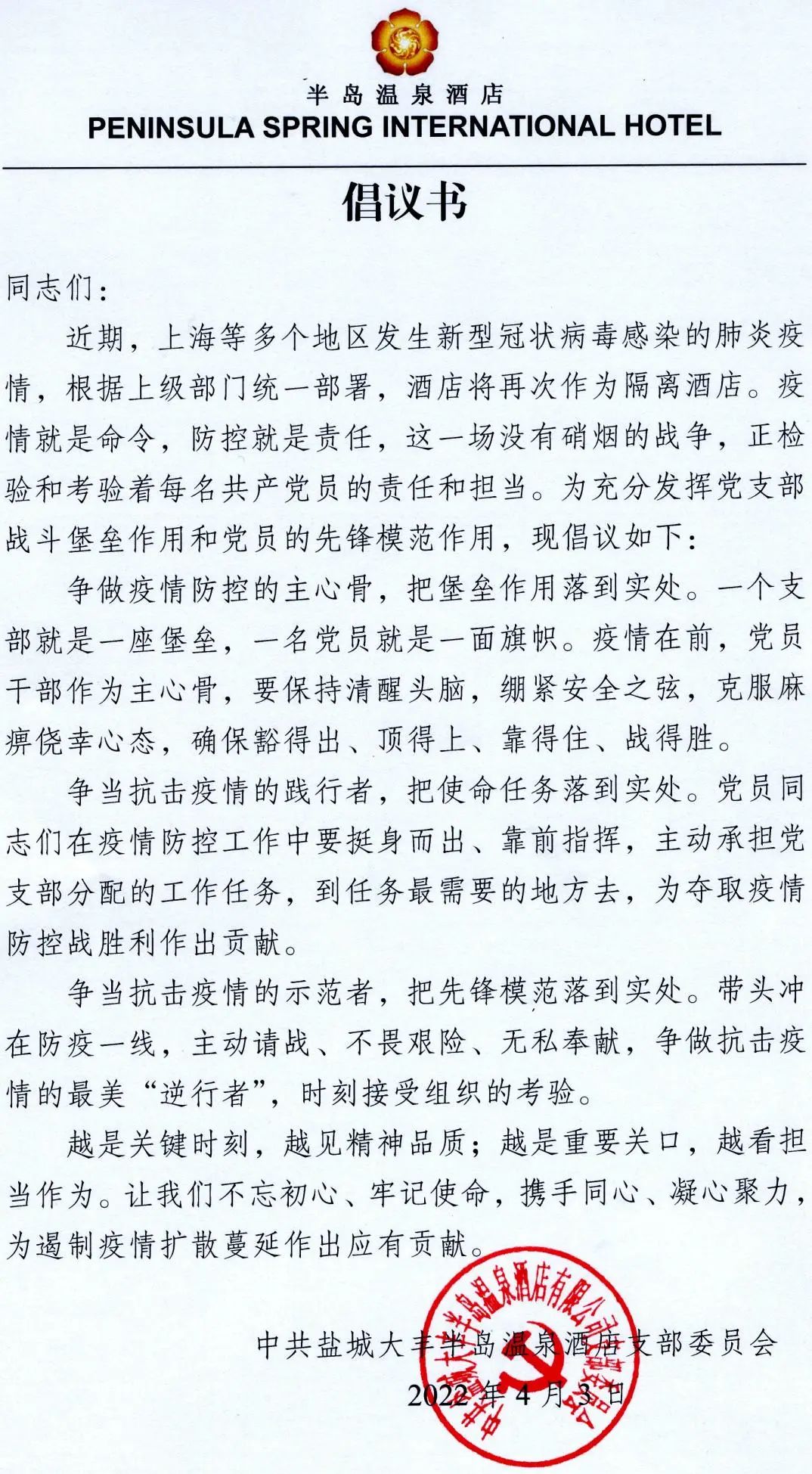 “我請愿:自愿參加酒店一線防疫工作,充分發揮黨員先鋒帶頭作用,堅決打贏疫情防控阻擊戰。”“我請愿:做嚴明紀律的踐行者,做擔當履職的戰斗員,請領導批準我參與此次隔離任務。”“我是一名入黨積極分子,我志愿參與酒店疫情防控任務,請讓我上一線”……一封封按著紅色手印的《請戰書》被遞交到鹽城港文旅集團旗下半島溫泉酒店黨支部。