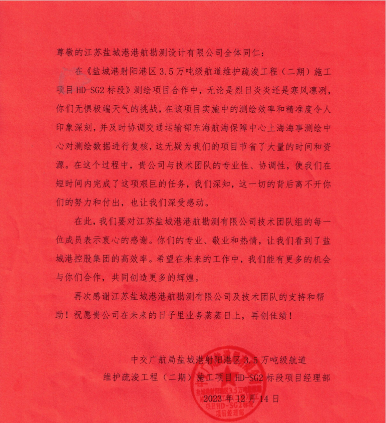 近日,鹽城港港航勘測(cè)設(shè)計(jì)公司收到來自中交廣航局鹽城射陽港區(qū)項(xiàng)目經(jīng)理部的感謝信,感謝港航勘測(cè)設(shè)計(jì)公司及技術(shù)團(tuán)隊(duì)的支持和幫助。