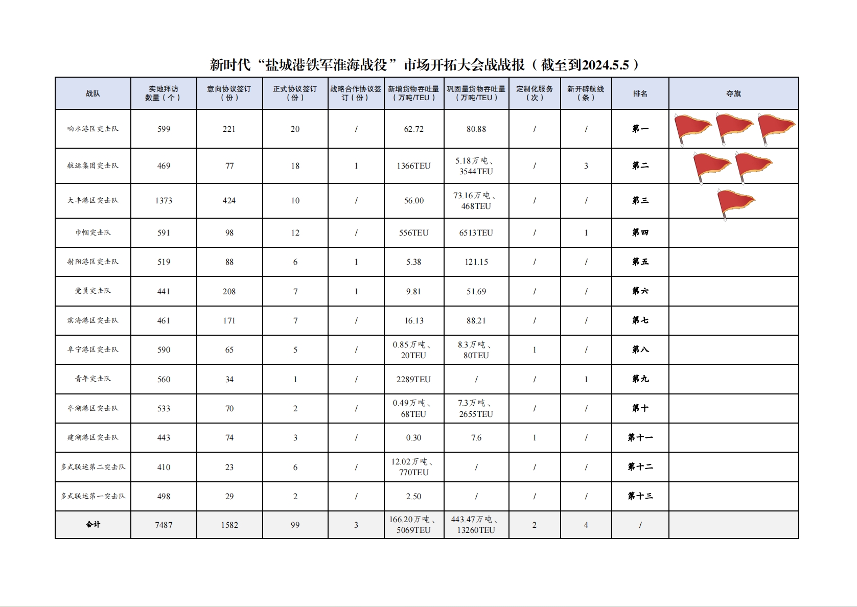 2.簽訂意向協議數量1582份:其中大豐港區突擊隊424份,響水港區突擊隊221份,黨員突擊隊208份,濱海港區突擊隊171份,巾幗突擊隊98份,射陽港區突擊隊88份,航運集團突擊隊77份,建湖港區突擊隊74份,亭湖港區突擊隊70份,阜寧港區突擊隊65份,青年突擊隊34份,多式聯運第一突擊隊29份,多式聯運第二突擊隊23份。