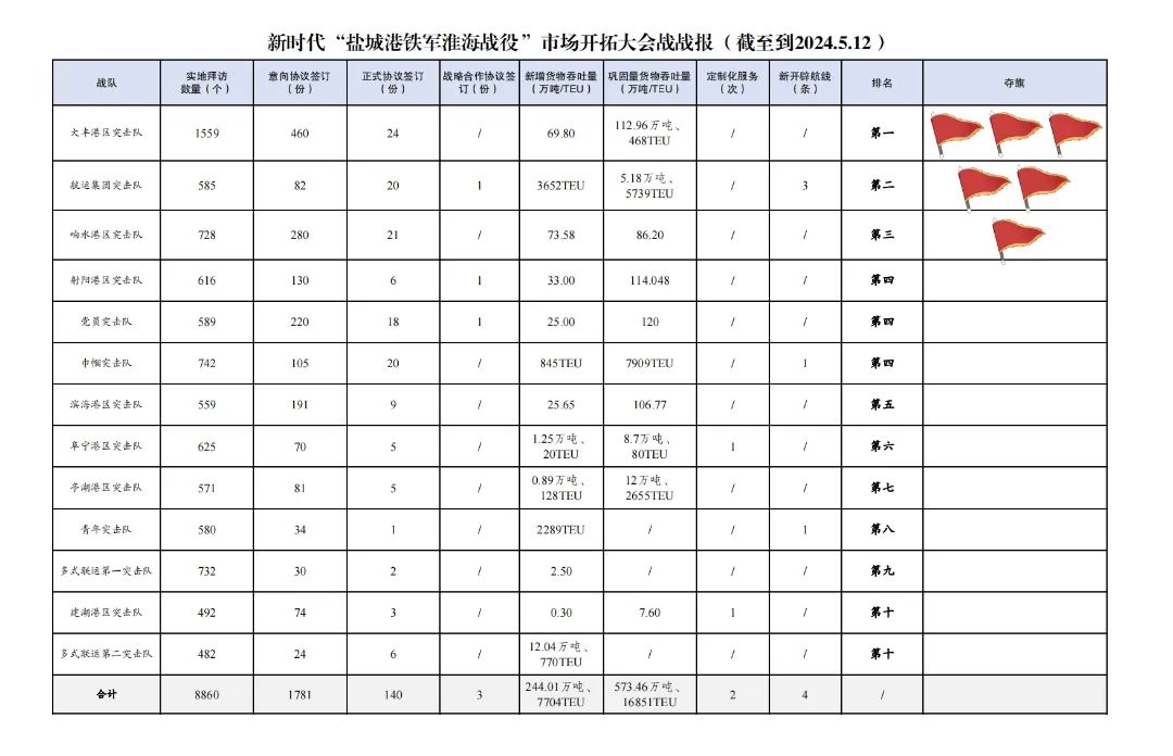 1.累計拜訪客戶數量8860家:其中大豐港區突擊隊1559家,巾幗突擊隊742家,多式聯運第一突擊隊732家,響水港區突擊隊728家,阜寧港區突擊隊625家,射陽港區突擊隊616家,黨員突擊隊589家,航運集團突擊隊585家,青年突擊隊580家,亭湖港區突擊隊571家,濱海港區突擊隊559家,建湖港區突擊隊492家,多式聯運第二突擊隊482家。