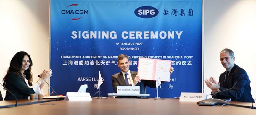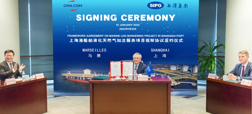 上海國際港務(集團)股份有限公司(“上港集團”)與法國達飛海運集團(“達飛集團”)于2022年1月12日舉行了上海港船舶液化天然氣(LNG)加注服務項目框架協議簽約儀式,上港集團董事長顧金山與達飛集團董事長、首席執(zhí)行官魯道夫·薩德出席。