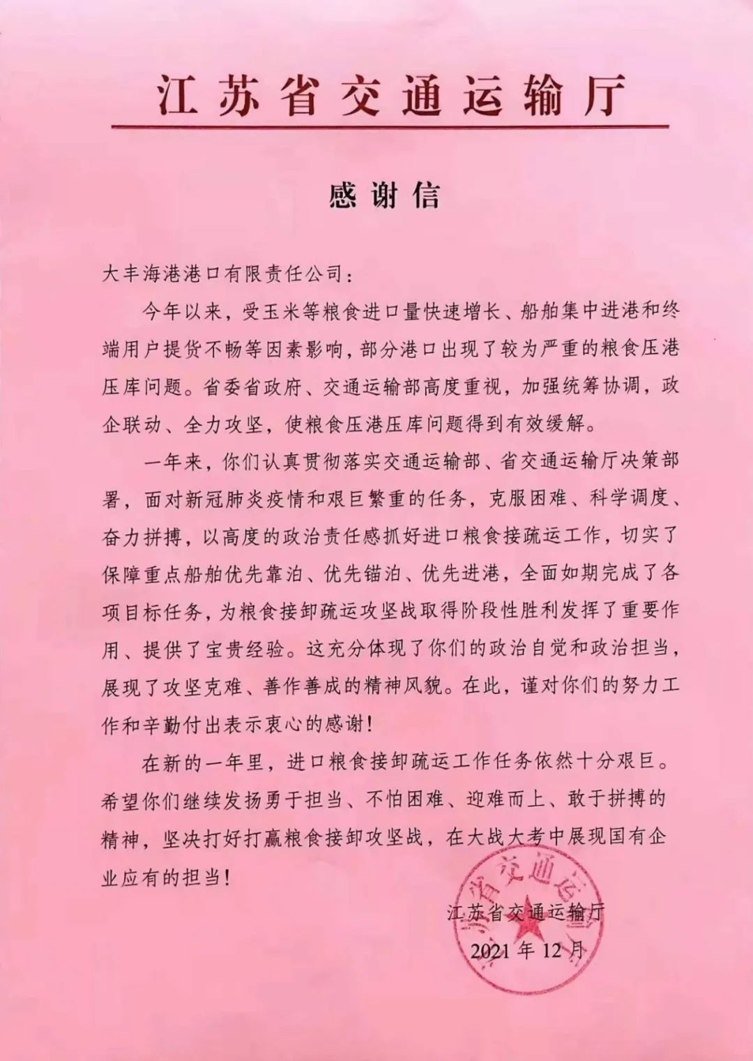 12月21日,省交通運輸廳向集團下屬港口公司發來感謝信,對港口公司面對新冠肺炎疫情和艱巨繁重的任務,克服困難、科學調度,努力抓好進口糧食接疏運工作,以及廣大干部職工的努力工作和辛勤付出表示感謝。