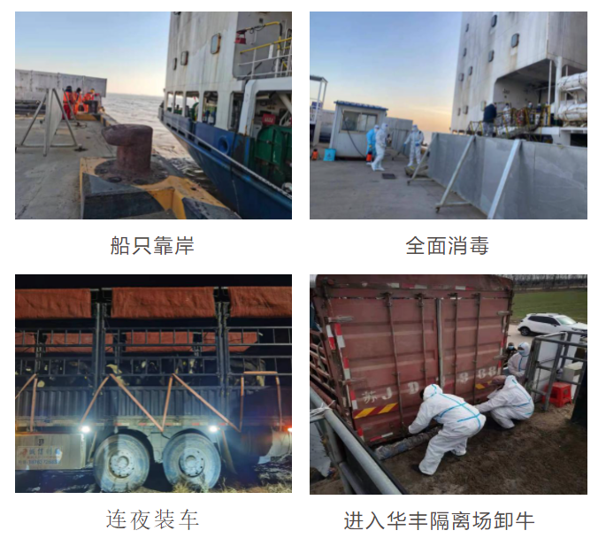 船舶靠岸后,工作人員積極搶抓時間,從27日下午17時至28日下午14時,始終堅守崗位連續工作近24小時,協同第三方認真組織開展防疫、消毒措施,在最短時間內完成了卸牛、運輸及種牛進場工作,為今年的種牛隔離業務畫上了圓滿的句號。