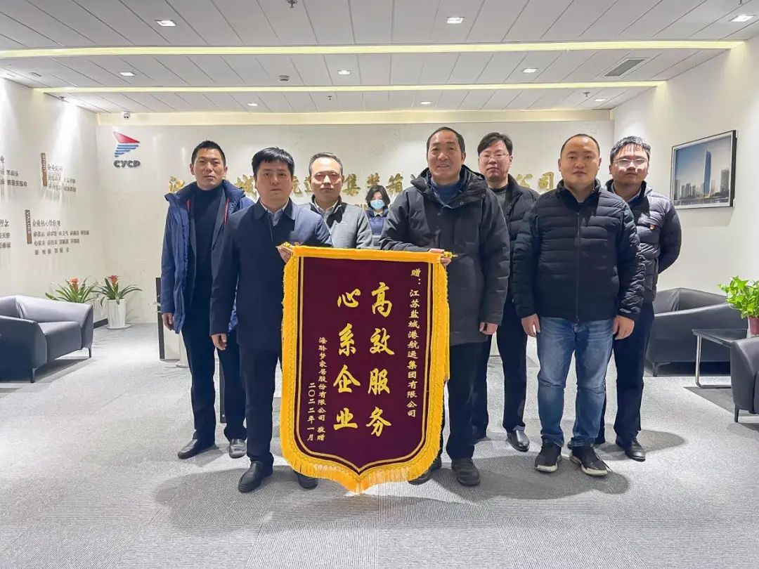1月25日,農歷小年這一天,南京海聆夢、鹽城東源偉業和鹽城海貝玩具三家公司不約而同來到鹽城港航運集團,分別將寫有“高效服務心系企業”、“振鹽城港航繁榮昌盛,興外貿企業輝煌發展”、“港企協作創佳績,細微之處顯真情”的錦旗送到了公司班子手中,感謝航運集團一年來在貨物出運上給予的大力支持。