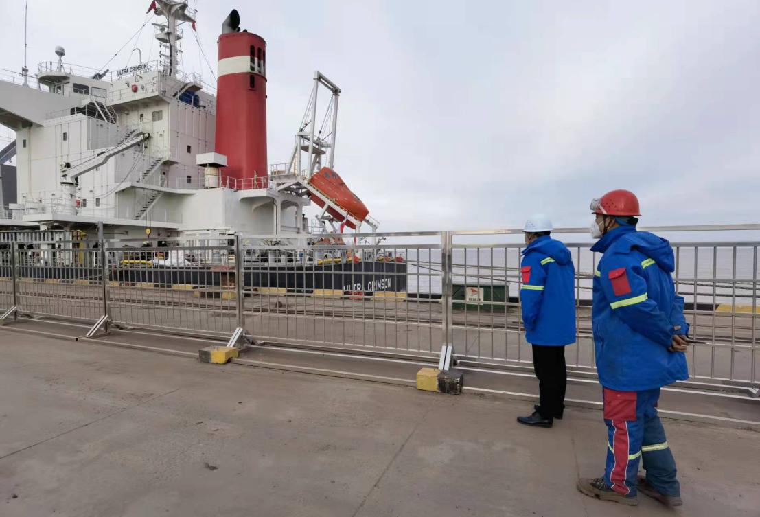 農(nóng)歷正月初二,外貿(mào)板材船“奧姆斯基115”停泊在糧食碼頭分公司6#泊位,碼頭作業(yè)人員嚴格執(zhí)行“內(nèi)外分開”要求開始裝卸作業(yè)。