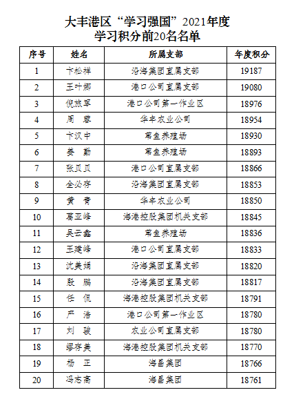 新的一年,為表彰先進、激勵后進,持之以恒地提高港區全體干部職工的學習自覺性和主動性,進一步加強學習型黨組織建設。近日,大豐港區舉行“學習強國”2021年度先進個人頒獎儀式,根據“學習強國”APP大豐港區年度學習積分排名,對成績突出的前20名“學習達人”代表進行了表彰,并頒發榮譽證書。