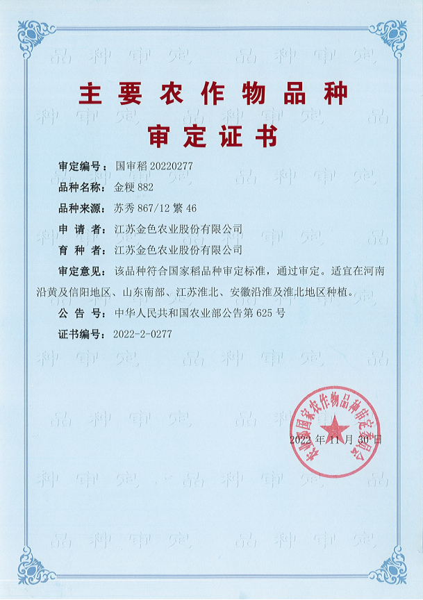 根據農業農村部公告第625號公布農作物新品種審定名單,江蘇金色農業股份有限公司自主選育的水稻新品種金粳882名列其中,同時也是該公司第三個自主選育的水稻新品種。