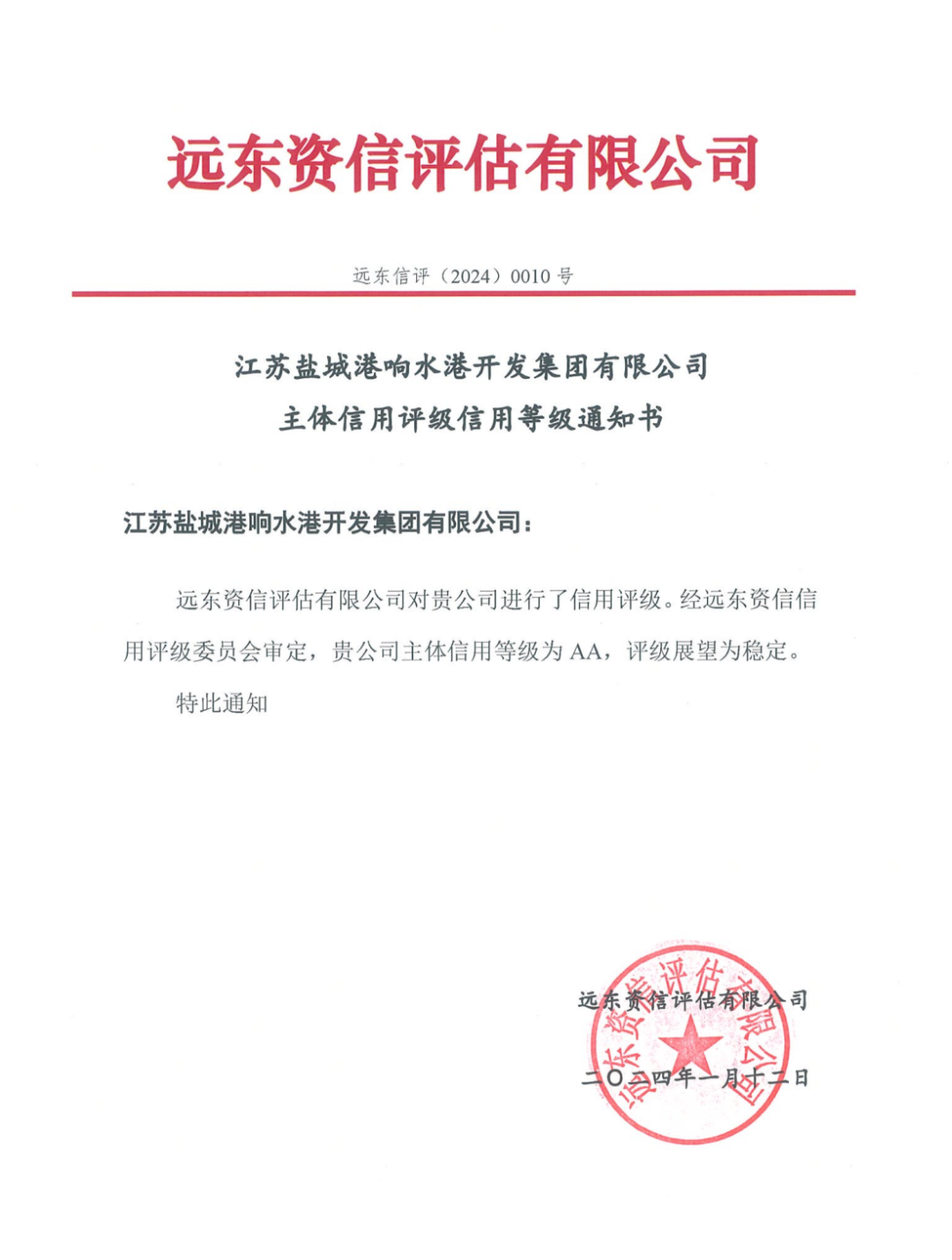 近日,遠東資信信用評級委員會審定,江蘇鹽城港響水港開發集團有限公司成功取得AA主體信用評級,評級展望為穩定。