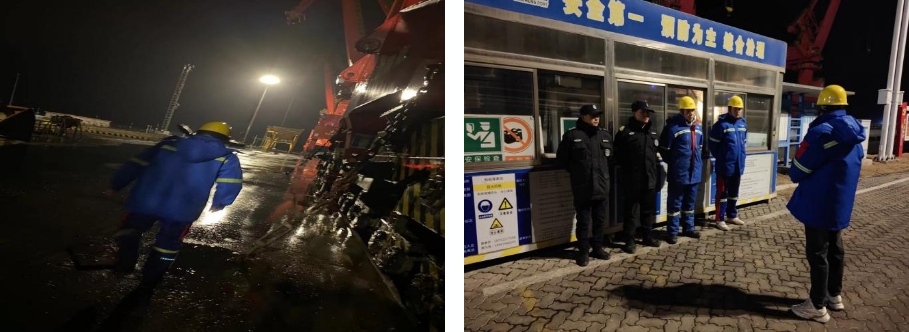 是班組長、是設備保障員,也是黨員?!拔沂屈h員我先上”是我們每個人的行為準則。寒潮來臨前,他們仔細檢查門機錨定插板、防風拉鎖、防爬器、鐵楔是否完全插入槽內;利用加桿檢查鏈條連接環是否受力至最大值;嚴格檢測防爬器是否落地牢靠;確保惡劣天氣下港區安全有序。