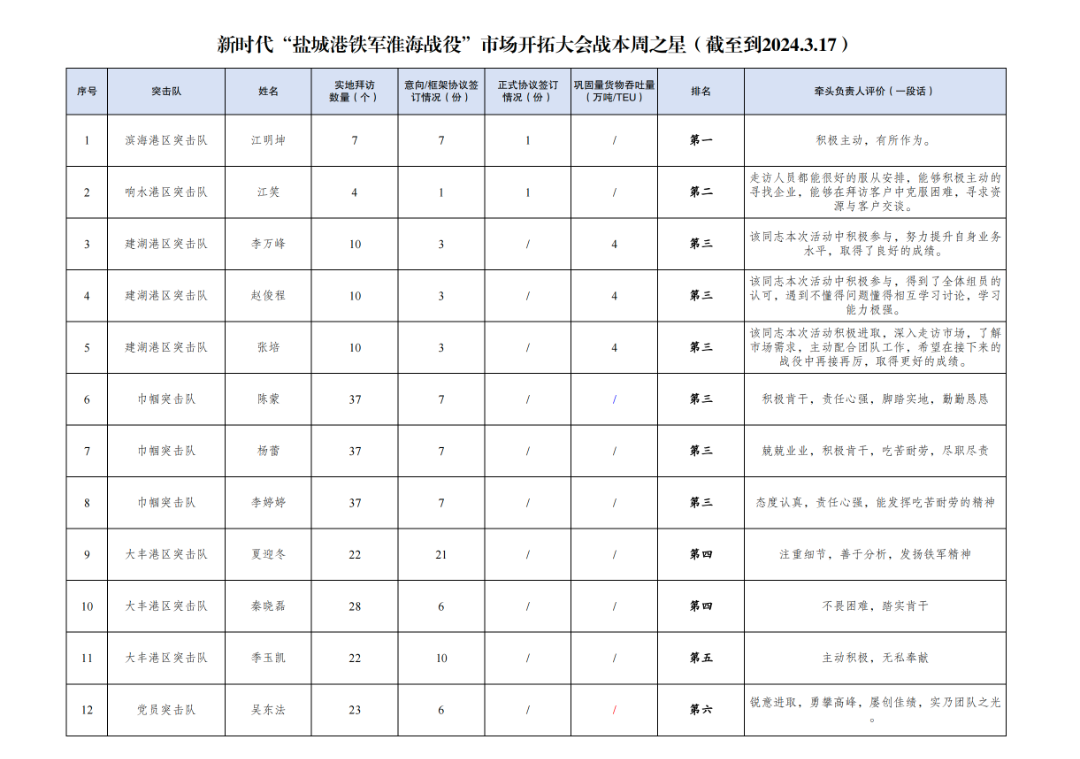 第三名:建湖港區(qū)突擊隊 李萬峰、趙俊程、張培(拜訪客戶10家,簽訂意向協(xié)議3份,鞏固貨物吞吐量4萬噸)、巾幗突擊隊 陳蒙、楊蕾、李婷婷(拜訪客戶37家,簽訂意向協(xié)議7份)