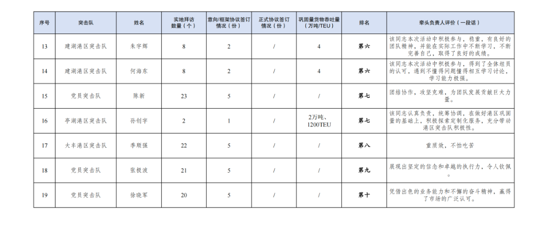 5.鞏固量貨物吞吐量11.3萬噸、2655TEU:其中亭湖港區(qū)突擊隊7.3萬噸、2655TEU,建湖港區(qū)突擊隊4萬噸。