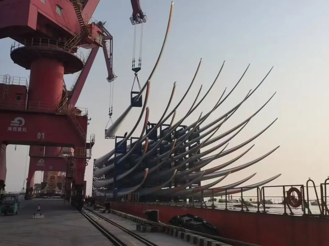據悉,此次葉片出口項目是遠景能源出口至印度坎德拉港EN-156項目的第5船,裝載量達到20套60片,射陽港區風電公司與業主單位反復溝通并根據碼頭實際情況,連續攻克堆碼數據驗證、作業中雙機聯動半徑實驗與集港運輸數據可行性驗證等技術壁壘,確保作業方案科學有序。