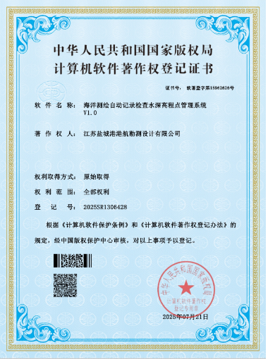 近日,勘測設(shè)計公司經(jīng)國家版權(quán)局審核,獲一項計算機(jī)軟件著作權(quán)登記證書,為《海洋測繪自動記錄檢查水深高程點管理系統(tǒng)V1.0》。
