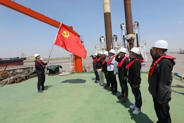 “我志愿加入中國共產黨,擁護黨的綱領,遵守黨的章程…”全體黨員面向黨旗重溫入黨誓詞,鏗鏘誓言久久回蕩,激勵著全體黨員不忘初心、牢記使命,彰顯港灣鐵軍擔當。 一名黨員就是一面旗幟,一個支部就是一座堡壘。突擊隊登上疏浚船,將黨旗牢牢插在項目上,躬身實干、不怕苦累,真真正正做實事,不走形式、不走過場。