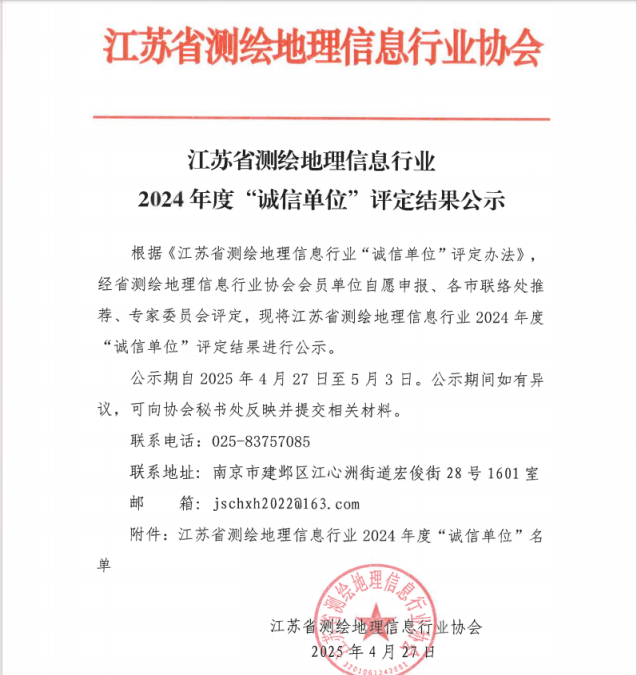 近日,江蘇省測繪地理信息協會正式發布2024年度行業"誠信單位"評選結果,鹽城港港航勘測設計有限公司憑借卓越的誠信經營表現和專業技術實力,成功獲評此項殊榮,不僅是對企業誠信體系建設的高度認可,更是對其在測繪地理信息領域專業能力和服務質量的全面肯定。