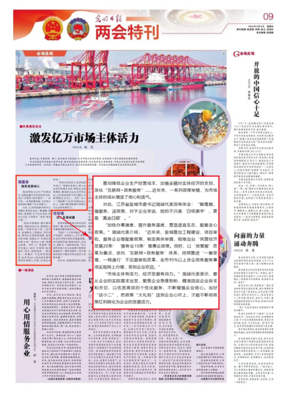 對此,江蘇省鹽城市委書記周斌代表深有體會:“解難題、強服務、送政策,對于企業來說,給的不只是‘白紙黑字’,更是‘真金白銀’。”